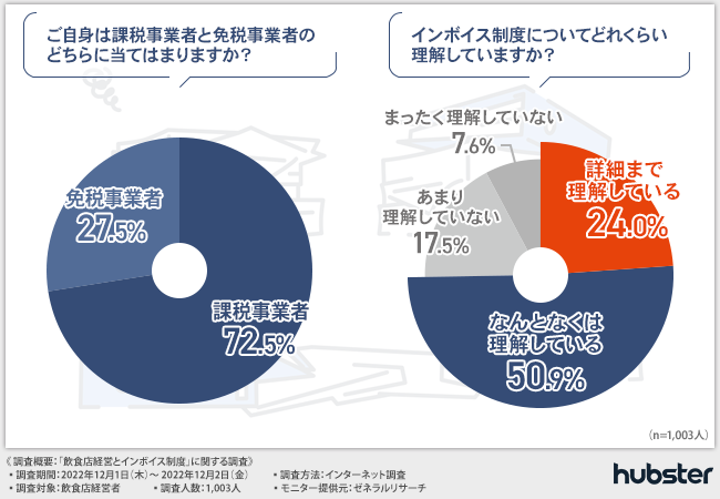 そこで今回、デリバリーサービスを一元管理するプロダクト『ハブスター(Hubster)』(https://www.tryhubster.jp/)を運営するTokyo Smart Restaurants合同会社は、飲食店経営者を対象に、「飲食店経営とインボイス制度」に関する調査を実施しました。