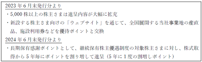 2024年3月末権利確定分(2024年6月末進呈)は経過措置として、継続保有株主優遇制度の対象で、かつ当社株式取得から5年以上経過している株主さまへ、保有年数にかかわらず株主優待ポイントの進呈区分に応じた長期保有感謝ポイントを進呈いたします。