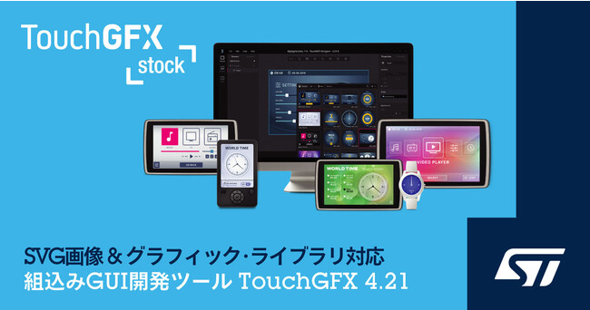 STマイクロエレクトロニクス(NYSE:STM、以下ST)は、組込みGUI(グラフィカル・ユーザ・インタフェース)開発ツール「TouchGFX」の最新バージョンを発表しました。このツールは、STM32マイクロコントローラ(マイコン)で動作するアプリケーション向けGUIの開発簡略化に貢献します。最新のTouchGFXバージョン4.21には、Google Fontから無償で入手できる多数のグラフィック・デザイン、画像、アイコンを備えた「TouchGFX Stock」が追加されています。これにより、ユーザによるグラフィック資産の管理が簡略化され、試作開発と最終製品において統一性のある美しいGUI開発が可能です。