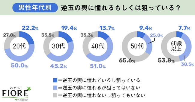 年代別にみると、20代男性は約22%の方が「逆玉の輿に憧れているし狙っている」という回答で、20代女性の割合よりも多い結果となりました。50代になり、「逆玉の輿を狙っている」という回答が10%未満になる傾向でした。