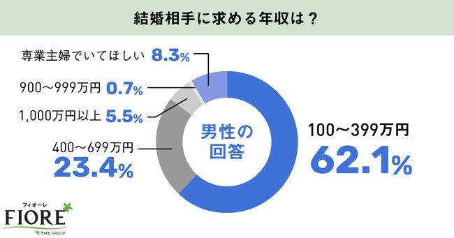 男性が結婚相手に求める年収としては、「年収100~400万円未満」と回答される方が約62%と最も多い結果でした。共働きを求める男性が約92%となり、「専業主婦でいてほしい」という回答は10%未満という回答でした。