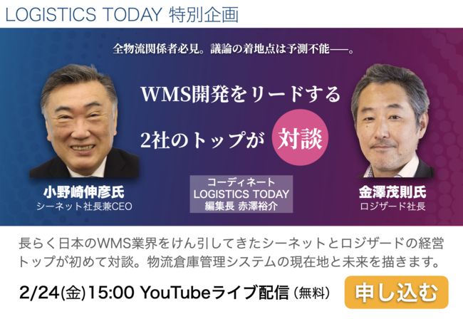 本イベントでは、同じくクラウド型倉庫管理システムを提供するロジザード株式会社(東京都中央区、代表取締役社長:金澤茂則)との対談が実現。経営トップらが、物流倉庫管理システムの現在地と未来について語ります。