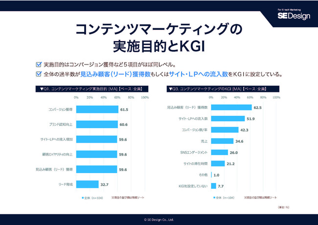 また「Q3.実施しているコンテンツマーケティングのKGIはどのようなものですか。当てはまるものを全てお知らせください(複数回答)」(n=104)と質問したところ、最も多い回答は「見込み顧客(リード)獲得数」で62.5%で、次いで「サイト・LPへの流入数」「コンバージョン数/率」となりました。KGIを設定していないケースは全体の7.7%であるので9割以上の会社がKGIを設定して運用しています。
