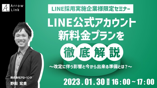 株式会社アローリンク(本社:兵庫県神戸市、代表取締役:蓬莱和真)は、2023/01/30(月)にLINE採用実施企業様限定で無料のオンラインセミナーを開催します。「LINE公式アカウント新料金プランを徹底解説! ~改定に伴う影響と今から出来る準備とは?~」と題し、LINE公式アカウントの新料金プランならびに今後の運用方法について詳しくお伝えします。