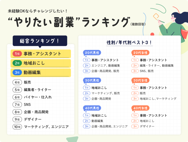 ~未経験でチャレンジしたい職種は「事務・アシスタント」、世代により「地域おこし」も注目~