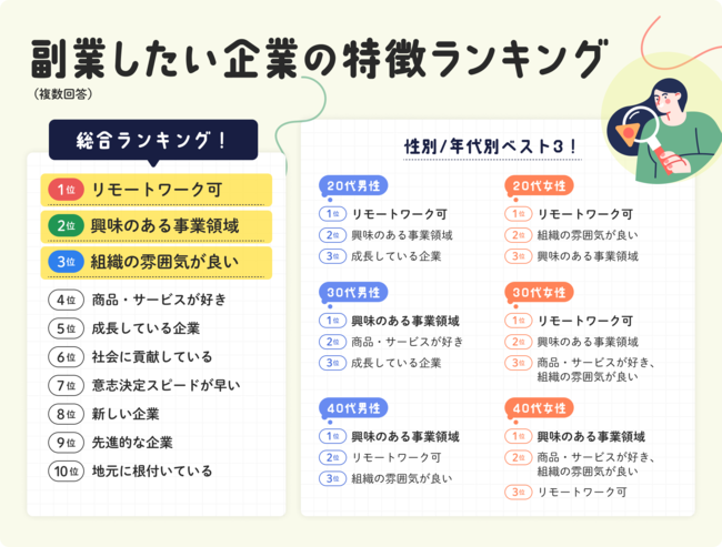 ・20代男女が副業したい企業の特徴は「リモートワーク可」、 30代以降は「興味のある事業領域」を支持