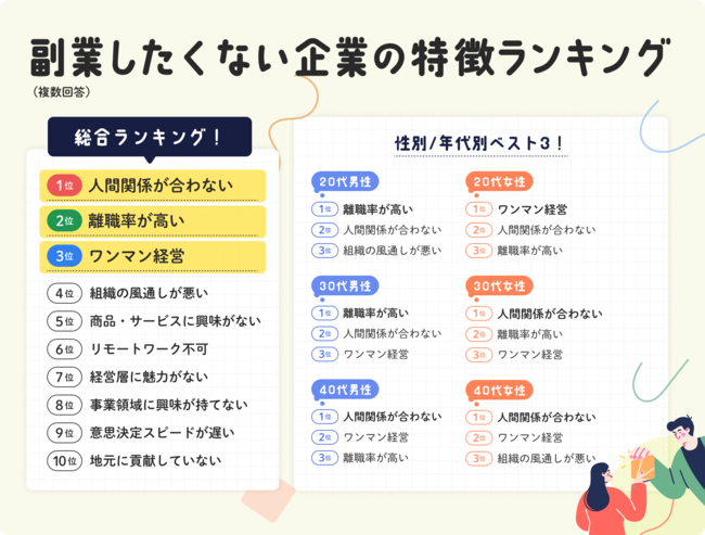 ・副業したくない企業の特徴で挙げられる「離職率の高さ」と「人間関係」