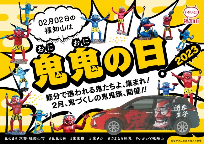 京都府福知山市は、「02」(オニ)の語呂合わせで2月2日を「鬼鬼の日」と名付け、鬼鬼の日から2月末まで、鬼にまつわるイベントが盛りだくさんの「鬼鬼祭」を開催します。コンセプトは、大江山鬼伝説のある「鬼のまち」らしく、「節分で追われる鬼たちよ、集まれ!」。3回目となる今回も20、30代の若手職員を中心に部署の垣根を越えて集まり、過去最大となる全14企画を考えました。『ウルトラマン』の美術総監督で知られる成田亨さんの迫力ある鬼の絵をラッピングした「鬼タク 特別仕様車」のお披露目や、日本の鬼の交流博物館30周年プレ企画「酒吞童子イラストコンテスト」、鬼グルメキャンペーンなど、鬼づくしの「鬼の祭典」です!