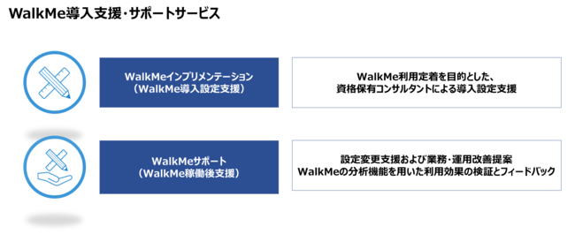この度、WalkMe社とともに、テレワーク・リモートワーク時代のオンボーディング支援を目的に、WalkMeが強みとする、シームレスなシステム横断、データの連携といった業務効率化の促進をはじめ、操作方法の吹出し表示や対話形式での自動入力など、豊富なナビゲーション機能によるユーザーの利用促進・定着化、テクノロジーの価値を導入パートナーとして最大化すべく、パートナー契約の締結と自社でのWalkMe利用を行い、導入支援・サポートサービスの提供を開始しました。