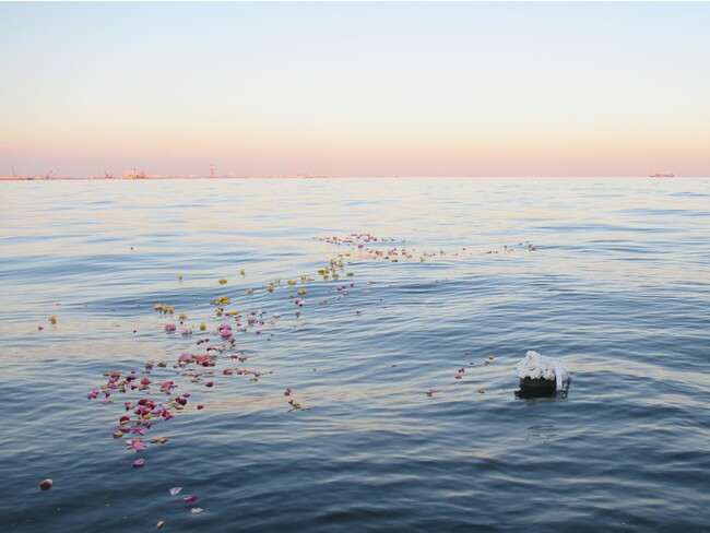 4. 海洋散骨当日。出航から40分ほどで散骨ポイントへ到着したら、袋を開封し、粉末化したご遺骨を海へ撒きます。海中に白いご遺骨があっという間に広がり、手向けた生花が海面にたゆたいます。