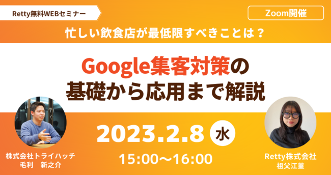 【2023年2月8日(水)15:00~16:00】トライハッチ × Retty 共催「~忙しい飲食店が最低限すべきことは? ~Google集客対策の基礎から応用まで解説」