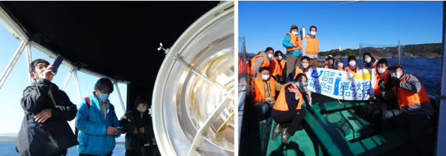 潮岬灯台は普段から見学可能な灯台ですが、今回は田辺海上保安部の協力により、通常は入れない灯室(ライトの置いてある部屋)まで登ることができました。またクルーズ体験では、海上から灯台を眺め、灯台の役割について学ぶと共に景観を味わい、講演会では、今回のプロジェクトで同時進行していた歴史調査の成果発表として、灯台の設計者や灯器の変遷(フレネルレンズ含む)について判明したことを発表しました。