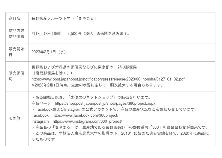日本郵便株式会社(東京都千代田区、代表取締役社長 衣川 和秀/以下「日本郵便」)は、生産からお届けまでを手掛けるオリジナル商品長野県産フルーツトマト「さやまる」の販売を、郵便局のネットショップで2023年2月1日(水)から開始します。また、同日から長野県および新潟県の郵便局ならびに東京都の一部の郵便局に設置するふるさと小包チラシでもお申し込みいただけます。(簡易郵便局を除く。別添参照。)