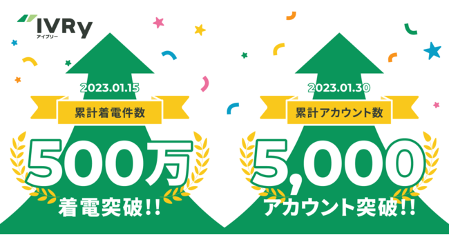株式会社IVRy(本社:東京都台東区、代表取締役CEO:奥西 亮賀、以下「当社」)は、当社が提供する電話自動応答サービス「IVRy(アイブリー)」において、累計着電数500万件、累計登録アカウント数5,000件を突破したことをお知らせいたします。