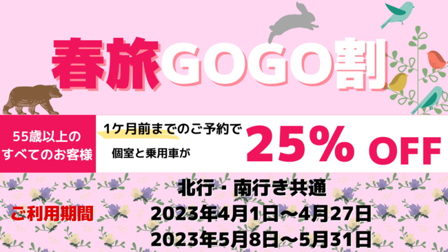 新日本海フェリーは、55歳以上のお客様を対象に個室・乗用車運賃が25%OFFになるおトクな企画商品割引「春旅GOGO割」を発表しました。ご友人やご家族、もちろんお一人旅でも、個室船室でゆっくりと流れる船旅時間をお楽しみください。