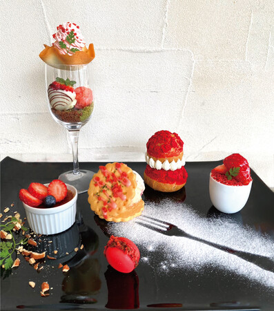 プレートに可愛く盛り付けられた苺のスイーツはホテルパティシエがひとつひとつ心を込めて作りました。ころんっとした形が可愛い「ルリジューズ」は上下のクリームが異なり2種類の味をお楽しみいただけます。その他、いちごモンブランを乗せたグラスの中にはホワイトチョコでコーティングされたいちご等が入っており様々な“苺”スイーツで春の訪れを感じながらご賞味ください。詳細は以下の通りです。