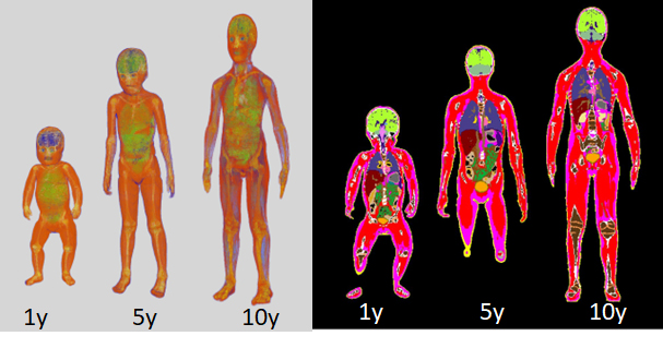 一方、これまでの小児の数値人体モデルでは、その多くが成人の数値人体モデルの簡易縮小版や特定の個人の解剖学的データを用いていたために、体形や臓器が小児の標準値から逸脱している等の問題がありました。そこで、NICTでは、個人差に影響されない一般性の高い数値シミュレーションを可能にするために、国際的な標準体形及び解剖学的構造を有する国際標準小児数値人体モデルの開発に取り組んできました。