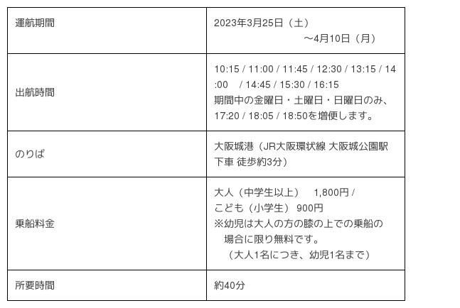 1983年より大阪市内で観光船を運航している大阪水上バス株式会社(本社:大阪市中央区 社長:奥村茂之)は、水都大阪の定番クルーズ「アクアライナー」にて、2023年3月25日(土)から4月10日(月)まで、春季限定クルーズ「アクアライナー 大阪城お花見クルーズ」を運航します。運航にあたり2023年2月1日(水)から、事前予約の受付を開始します。