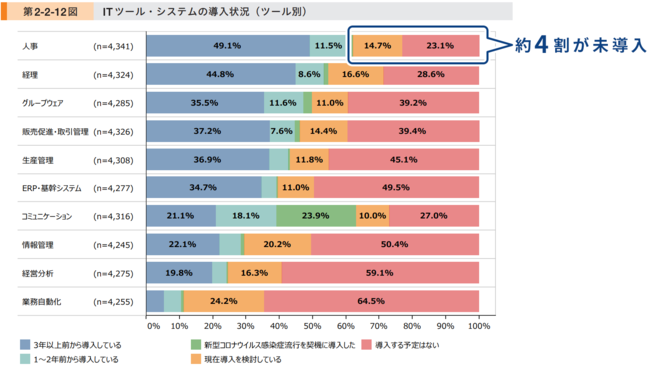 一方、我が国の状況として、コロナ禍で中小企業のデジタル化は進んでいるものの、依然として、約4割の中小企業で、人事関連(勤怠管理、給与計算等)のITツールの導入ができていないという状況が見られます。