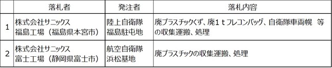株式会社サニックス(福岡県福岡市、代表取締役社長 宗政 寛)は、以下の通り、自衛隊の産業廃棄物収集運搬処理(スポット)についての一般競争入札を落札いたしました。