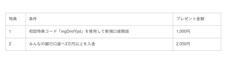 みんなの銀行の口座開設、および3万円以上の入金で3,000円プレゼント