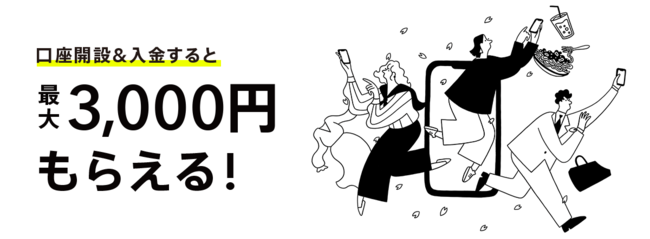 初回特典コードをご利用のうえ期間中に口座を開設していただいたお客さまに1,000円、さらに開設された口座へ期間中に3万円以上入金された方には2,000円、最大合計3,000円をプレゼントします。