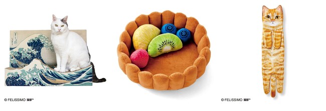 左から「名画をたしなむ猫のつめとぎ〈葛飾北斎 神奈川沖浪裏〉」「フルーツタルトの具になってスヤァ スイーツにゃんこクッション」「こんなに伸びるの!?なが~い猫タオル」