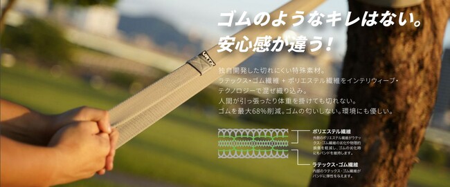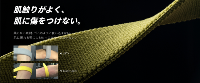 独自のインテリウィーブ・テクノロジー(布繊維とゴム繊維を混紡)を用いて開発されたフィットネスバンドです。この技術は米国にて既に特許取得済みで、日本でも特許申請中の独自製法です。(https://vrtxsports.co.jp/pages/characteristics)
