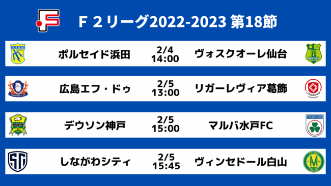 2月4日(土)、5日(日)に開催するFリーグ2022-2023 ディビジョン2 第18節の4試合を以下の通り、ELEVENにてライブ配信いたします!全試合を無料でご視聴いただけますので、ELEVENのアプリをダウンロードいただき、ぜひご視聴ください!