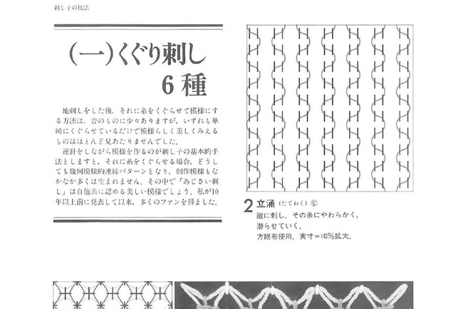 その図案を使った作品例も多数掲載。刺し子ファンにはたまらない内容です。口絵では、銀座亜紀枝さんデザインの様々な刺し子のウエアや小物の作品をカラーで掲載。