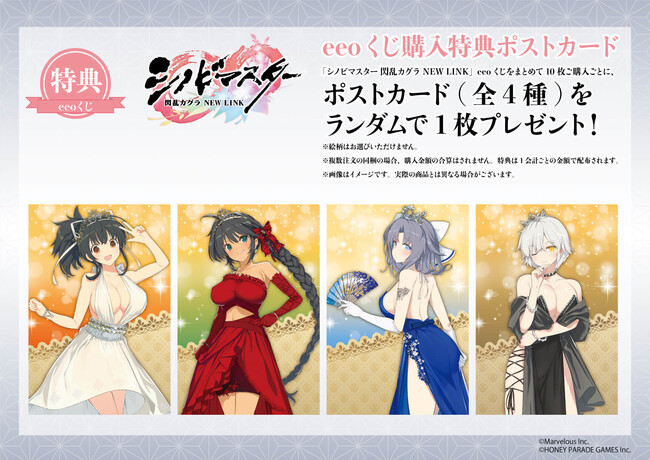 『シノビマスター 閃乱カグラ NEW LINK』の「eeoくじ」をまとめて10枚ご購入いただくと、購入特典としてポストカードをプレゼント! ポストカードは4種類あり、ランダムで1枚お渡しします。