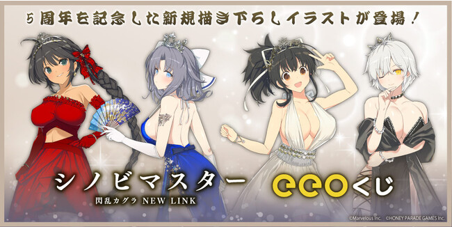 5周年にふさわしい飛鳥たち4人の艶やかなドレス姿、そしてゴージャス感にあふれた『シノビマスター 閃乱カグラ NEW LINK』の「eeoくじ」。豪華景品をゲットして、飛鳥たちと一緒に5周年を改めてお祝いしましょう!