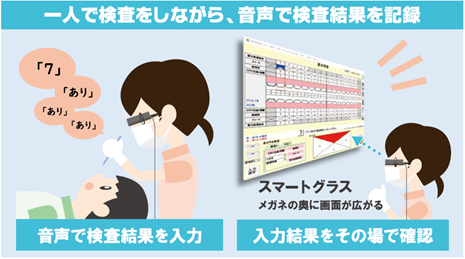 本システムは、東和ハイシステムの歯科医院向け電子カルテシステムと日立のAI音声認識技術*2および「Recware」*3の音声テキスト化機能を連携・融合することで、歯科医が診療中に手袋を外さず音声だけで電子カルテを作成・操作することを実現します。また、スマートグラス*4を装着することで、視線を少し動かすだけで120インチサイズ相当の大画面を通じて電子カルテの内容確認が可能となります。例えば、歯周病検査においては、歯科衛生士が検査をしながら音声入力で検査結果を記録できるようになり、これまで2人で行っていた歯周病検査が1人で行えます。さらに患者との会話の記録も音声データで電子カルテに保存できます。