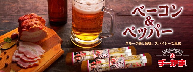 ベーコンのスモーク感と旨味、ペッパーのスパイシーさが特長のチーかまです。
