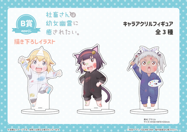 B賞には、描き下ろしイラストを使用した150×70mmのキャラアクリルフィギュアが登場。お顔やつなぎに絵具をいっぱいつけて、無邪気に“おえかき”を楽しむ幽霊ちゃん&みゃーこ&リリィ。チャーミングな3人にキュンキュンが止まりません……!