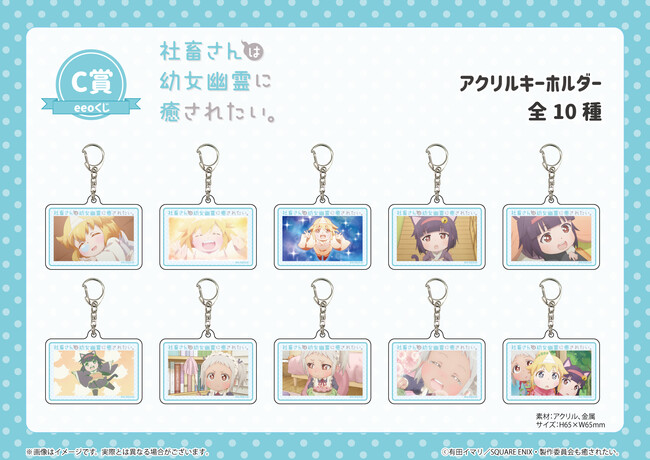 C賞には、アクリルキーホルダーが全10種ラインナップ! 65×65mmの大きめキーホルダーには幽霊ちゃんの寝顔、みゃーこの上目遣い、リリィのツンデレ表情などTVアニメの印象的なシーンが描かれており、眺めているだけで心がじんわりと温まります。