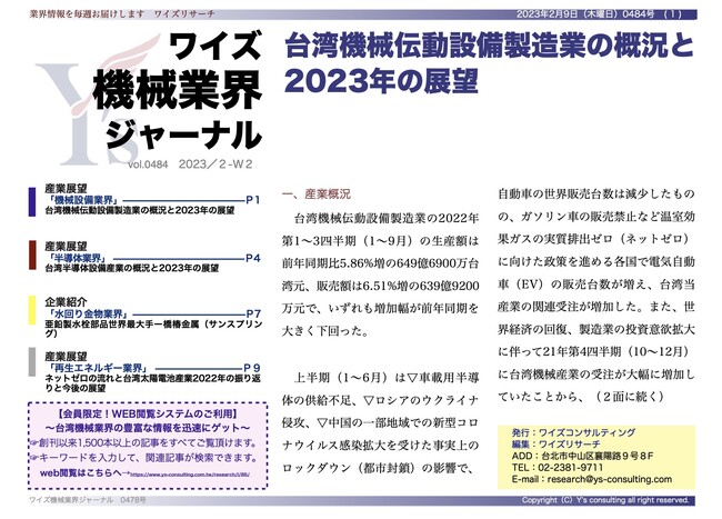 ワイズコンサルティング グループ(本社:中華民国台北市、代表取締役:吉本康志)は台湾機械業界専門誌「ワイズ機械業界ジャーナル」の2023年2月第2週号を発行しました。今週号では、機械設備業界、半導体業界、亜鉛製水栓部品世界最大手の橋椿金属(サンスプリング)と再生エネルギー業界の最新動向を紹介します。