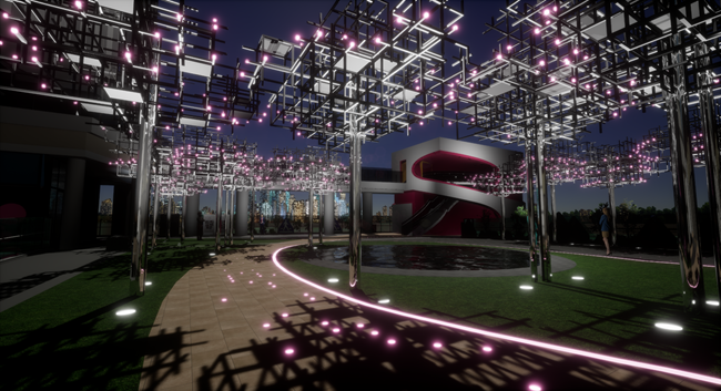 リアルとヴァーチャルを横断する総合的なクリエイティブ力をベースに、豊かな世界観と体験をつくるデザインコレクティブであるFLOWPLATEAUX「フロウプラトウ」を空間演出プランナーとして起用します。人流や気象データなどを活用した演出によって365日異なる空間を創出します。空間演出の為に独自に開発した小型照明約1,200個を立体的に配置し、音響と照明を連動させることで、にぎわいSTAGE全体を一体として演出します。