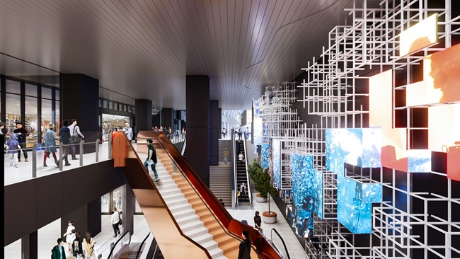 最先端のトレンドやカルチャーを創出・情報発信を担う商業施設は約15,200平方メートル の店舗面積を有し、多種多様なテナントが出店します。情報発信の拠点となる「イベントスペース」と「デジタルサイネージ」、様々なコミュニティが生まれる「にぎわいSTAGE」や、安らぎを感じられる緑豊かな「はぐくみSTAGE」など、それぞれの目的に合ったスペースを整備しています。商業施設での体験を通して、多様な趣味を楽しむ人々や最先端のクリエイターが集う場所を生み出します。