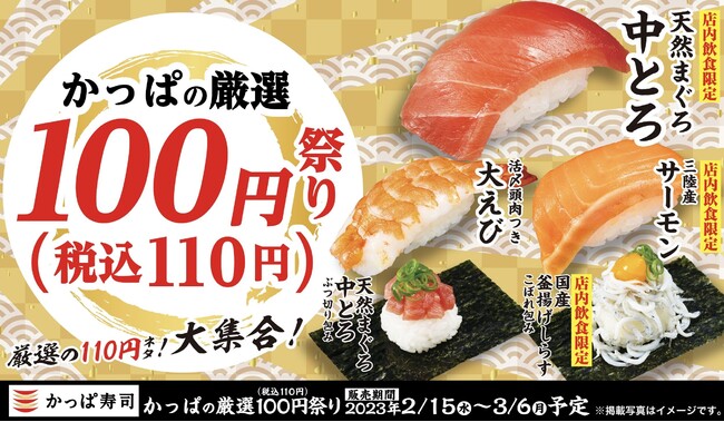 コロワイドグループのかっぱ寿司(カッパ・クリエイト(株) 本社:神奈川県横浜市)は、2023年 2月 15 日(水)~3月 6 日(月)の期間『かっぱの厳選100円(税込110円)祭り』を、かっぱ寿司全店にて開催いたします。また、同期間にて『かっぱの期間限定ごちネタ!』も開催いたします。