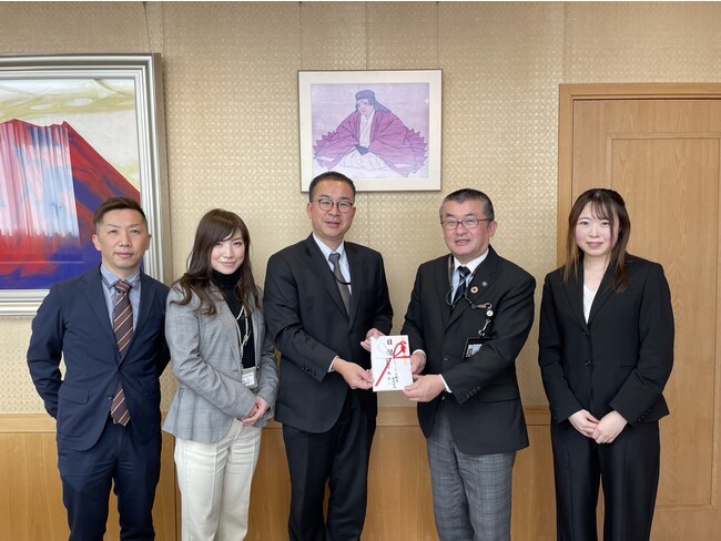 (写真左から)当社総務部総務課 山本、柿崎、総務部部長 石貝、吉田市長、田村