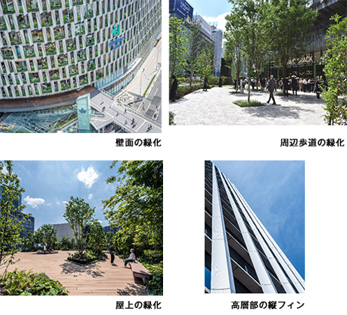 本建物の壁面や屋上の緑化と本建物周辺の歩道の緑化を、梅田地区の植生である「淀川水系」と「六甲山系」の在来種を主体とした樹種構成により一体的に行っており、ヒートアイランドの抑制や生物多様性の保全及び良質な景観の形成に寄与している。
