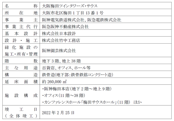 阪神電気鉄道株式会社、阪急電鉄株式会社、阪急阪神不動産株式会社の3社で開発した「大阪梅田ツインタワーズ・サウス」が、このたび、大阪府が主催する「第16回おおさか優良緑化賞」の大阪府知事賞・生物多様性賞と、大阪府・大阪市が主催する「令和4年度おおさか環境にやさしい建築賞」の大阪市長賞をそれぞれ受賞しましたので、お知らせします。