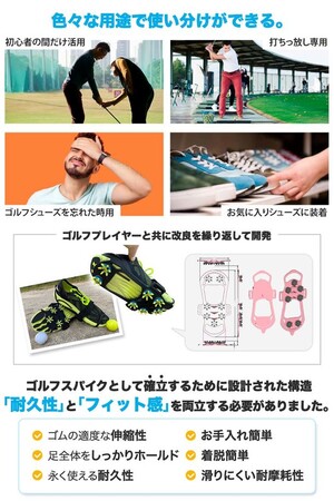 本製品は、今までになかった発想でスニーカーや運動靴の上から履くだけで簡単にゴルフシューズにすることができるのが大きな特徴です。