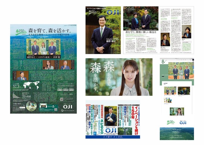 2月12日付の朝日新聞朝刊では、王子ホールディングス代表取締役社長・磯野裕之さん、同社の母体を創業した渋沢栄一の玄孫・渋澤健さん、トラウデン直美さんの特別対談を掲載し、2月12日と13日のテレビ朝日で、トラウデン直美さん出演の特別CMを放送します。また13日発売の「AERA」では磯野社長と木村恵子編集長による対談企画を掲載し、東京メトロで中吊りも実施。複数のメディアを活用し、「森を育て、森を活かす」ことを目指す王子ホールディングスの経営理念やパーパスを分かりやすく発信します。