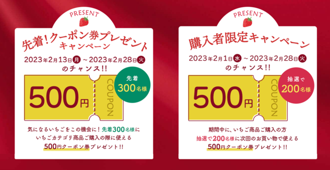キャンペーン第2弾として、本日から先着300名様にJAタウンの「いちごカテゴリ」の商品にその場で使用できる500円クーポンをプレゼントします。クーポンコードは該当商品の商品ページに掲示されます。この機会に、気になるいちごをぜひお召し上がりください。