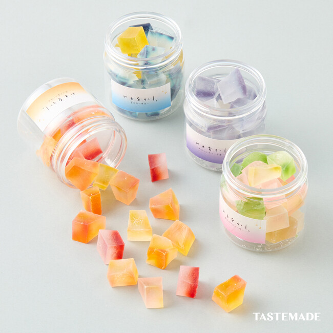 琥珀糖の開発商品は「食べる宝石“いとをかし”」。清少納言の枕草子をモチーフに、日本の四季をイメージした4種をご用意。人工着色料は使わず、宝石のような色合いとイチゴ味やブルーハワイ味など幅広い味展開を楽しめます。