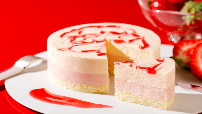 やさしい甘さのあまおう苺ムースに、上品な甘さのミルクチーズムースを重ねました。マーブル模様の仕上がりで、あなただけのきらめきを添えて。
