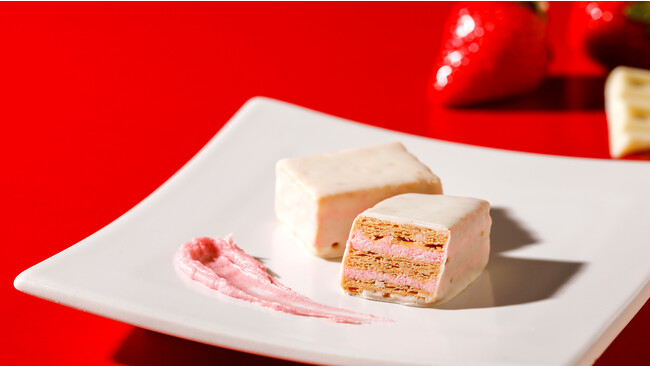 みずみずしく甘酸っぱいあまおう苺クリームを香ばしく焼き上げられたサクサクのパイでサンドし、ホワイトチョコレートで包み込みました。