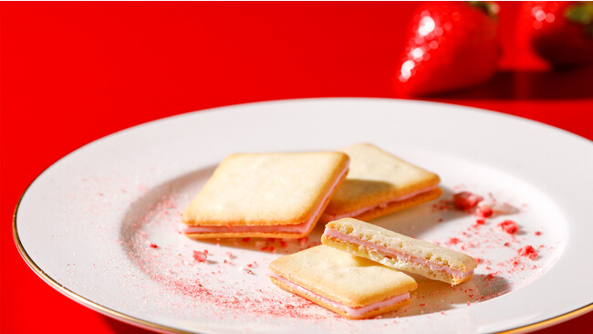 ジューシーで甘酸っぱいあまおう苺を閉じ込めたパウダー入りのチョコレートを、シンプルに焼き上げられたサクサクのクッキーでサンドしました。